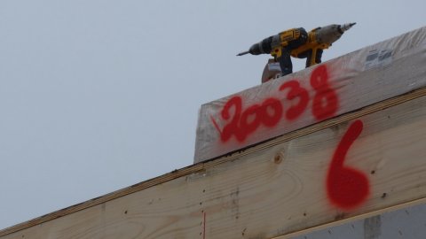 Tidligt - kl. 09:30 - var der ingen på byggepladsen, og det regnede ned selvom alle tagelementer også på garagen var monterede.