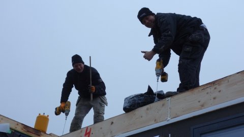 Ja, der går en tømrer på taget. | ![]() Prof værktøj. | ![]() Profferne i gang med de sidste arbejder.