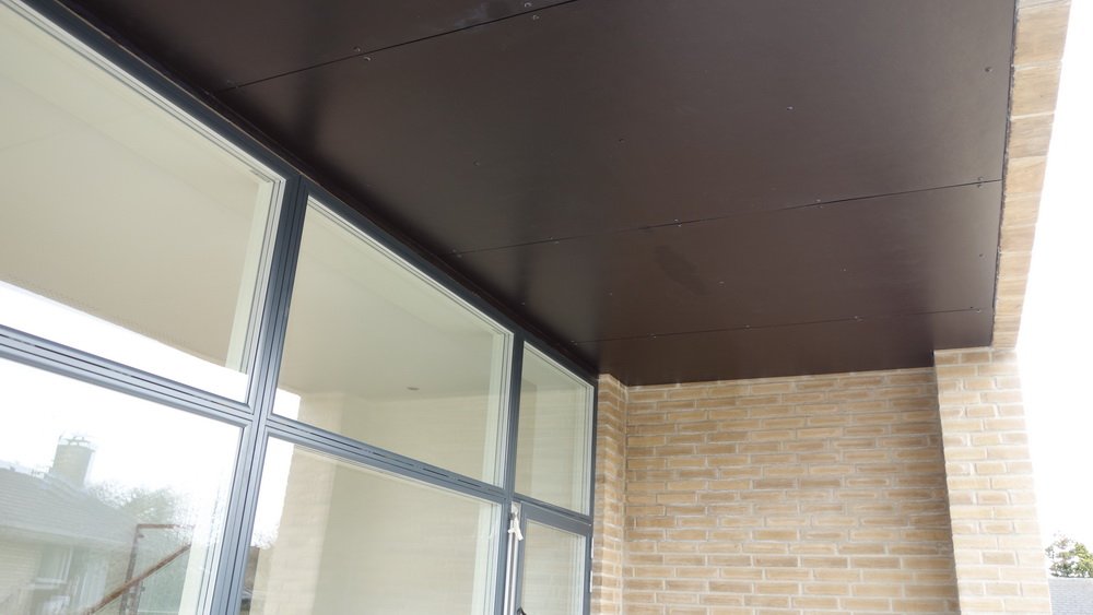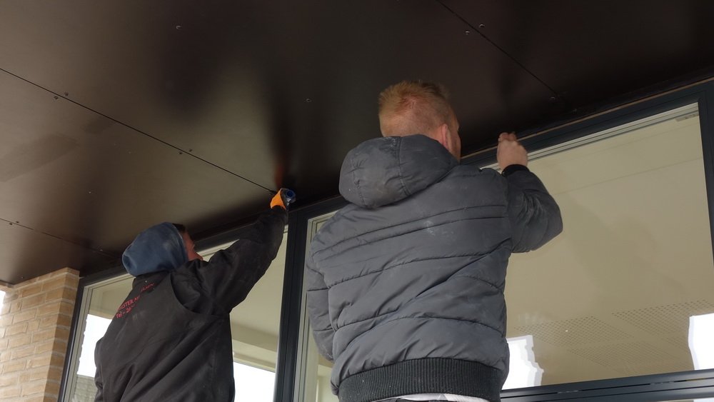 Underbeklædningen på udhænget ved stuen med sorte plader monteres. Overdækningen over hoveddøren er næste projekt denne fredag hvor jeg undtagelsesvis besøgte byggepladsen 2 gange.