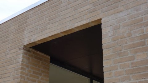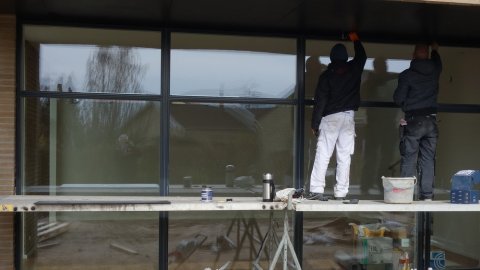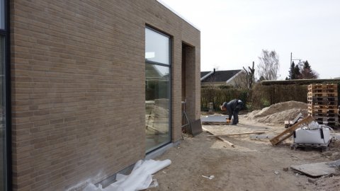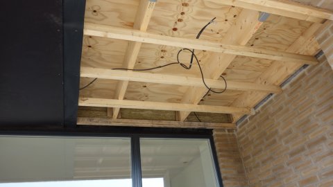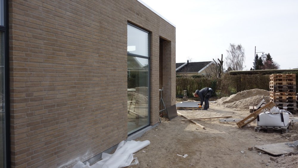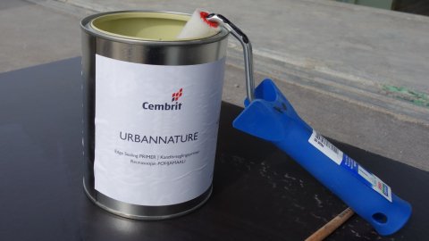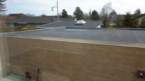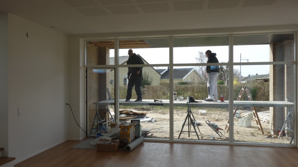 ![]() Overfladebehandling af de sorte plader. | Overdækningen ved stuen | ![]() får den sidste overfladebehandling. |