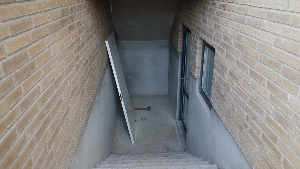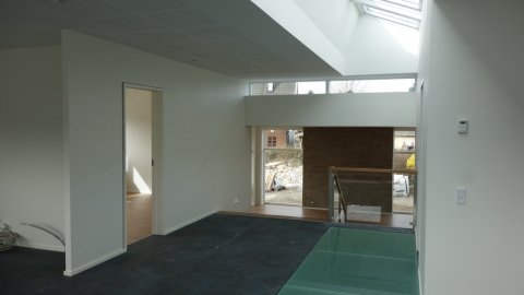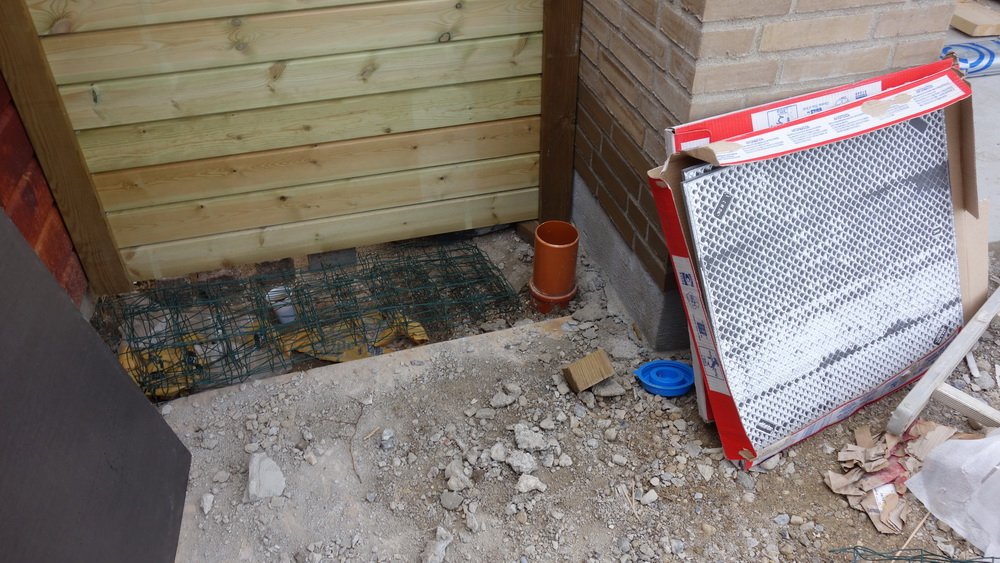 Glasgulvet set fra kælderen. | De sidste plader mangler i overdækningen ved stuen. | Lidt tættere på et regnvejrsafløb er vi dog. |