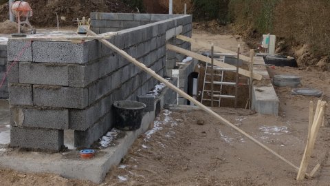 Igår torsdag blev de sidste blokke lagt, og der blev afstivet og sikret så stormen/orkanen "Bodil" ikke kunne få ordentlig fat. Men det gjorde den alligevel men kun to steder, der ligger nu 5+1 skifter på jorden. Afstivningen holdt ikke. Alt andet er bare klart til montering af remme. Disse er også leveret.
