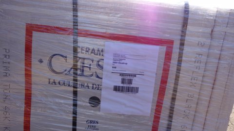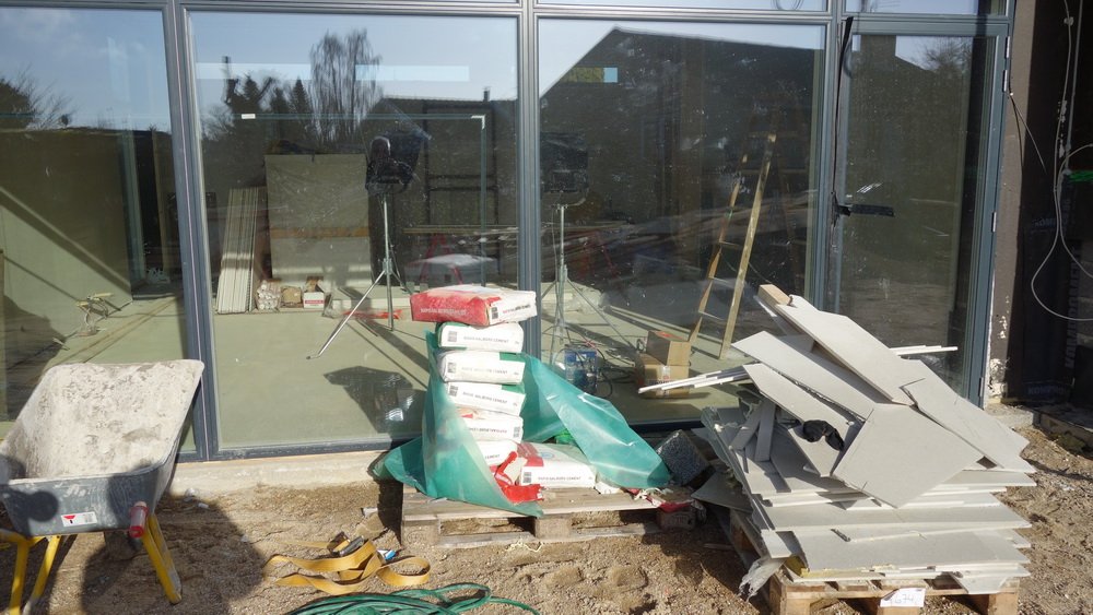 Denne mandag er der ingen håndværkere i gang. Der er kommet nogle fliser, 4 paller for at være præcis. Der er også placeret en campingvogn, det er vist flisemurernes, og den sidder solidt fast.