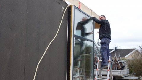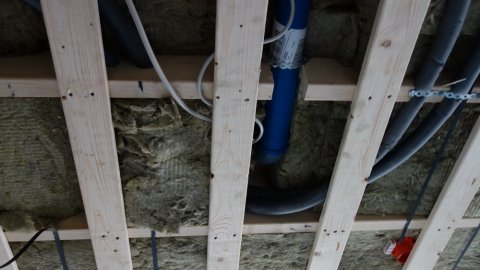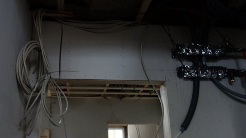 4 håndværkere i gang, 2 tømrere og 2 elektrikere i fuld gang. Tømrerne sætter vægplader op og har monteret døren til kælderen. Der er sat lidt varme på for at tørre noget på det.