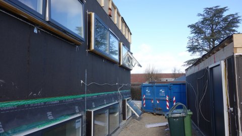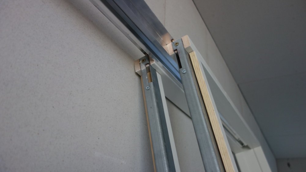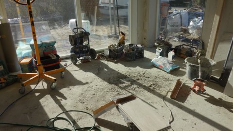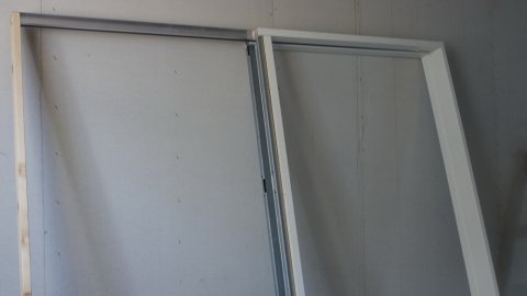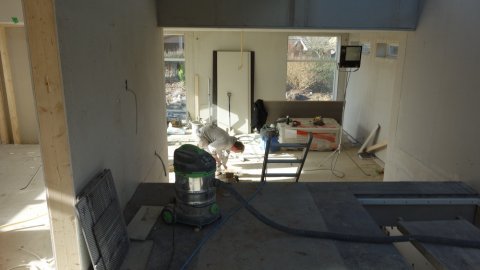 Tømrerne monterer skydedørsarrangementet og sliber vægge. Herefter er der dømt oprydning, for det varer en rum tid inden vi mødes igen.