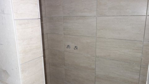 Flisemurerne lægger de sidste fliser i øerste bad. Herefter er der kun nogle enkelte fliser der mangler, og så skal alt fuges.