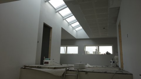 Malere, murere og til slut tømrerne er ved at komme op i omdrejninger og få klistret væv op, få lagt de første sten og lavet de første inddækninger - jo der er gang i den.