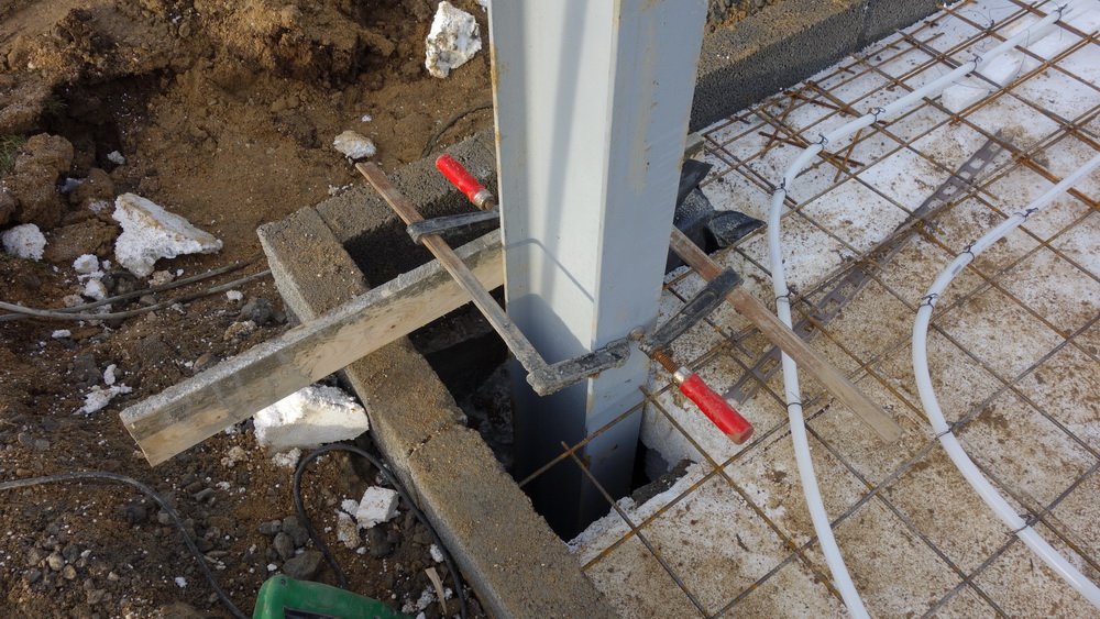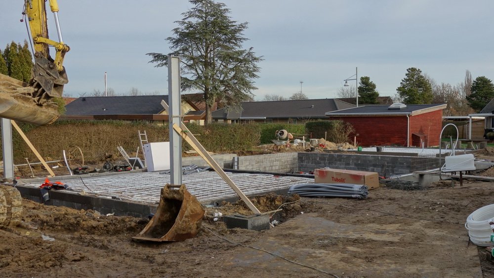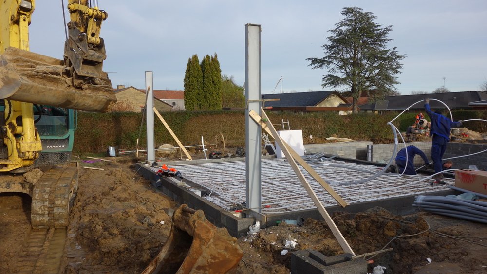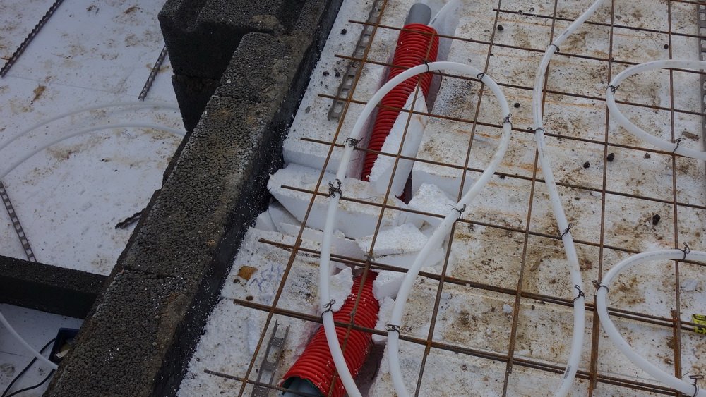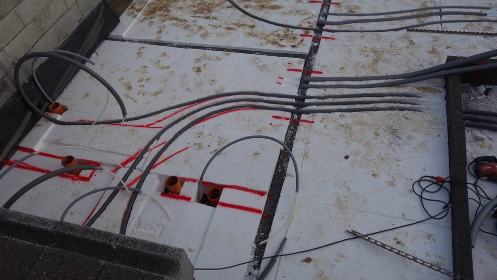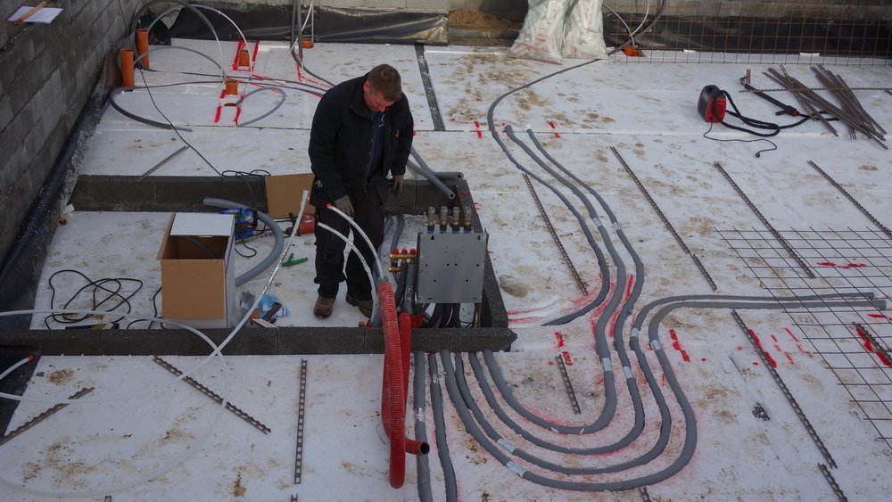 Gulvvarmerør "nettes" og brugsvandsrør monteres i fordelingscentralen. Der brændes noget flamingo i garagen, så der også der kan placeres nogle bære I-bjælker, så spændvidden er tilstrækkelig. Ligesom dem i stuen.