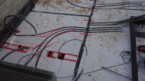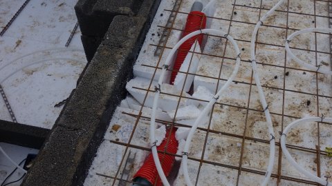 Klar til en ordentlig klat beton. | Man kan godt gå på nettet, selvfølgelig uden at træde på gulvvarmerø [...]rene. Nettet løftes med nogle plastholdere. Læs mere...↑ | ![]() El og vand er spændende, og nogen kan se elegancen i teknikken. |
