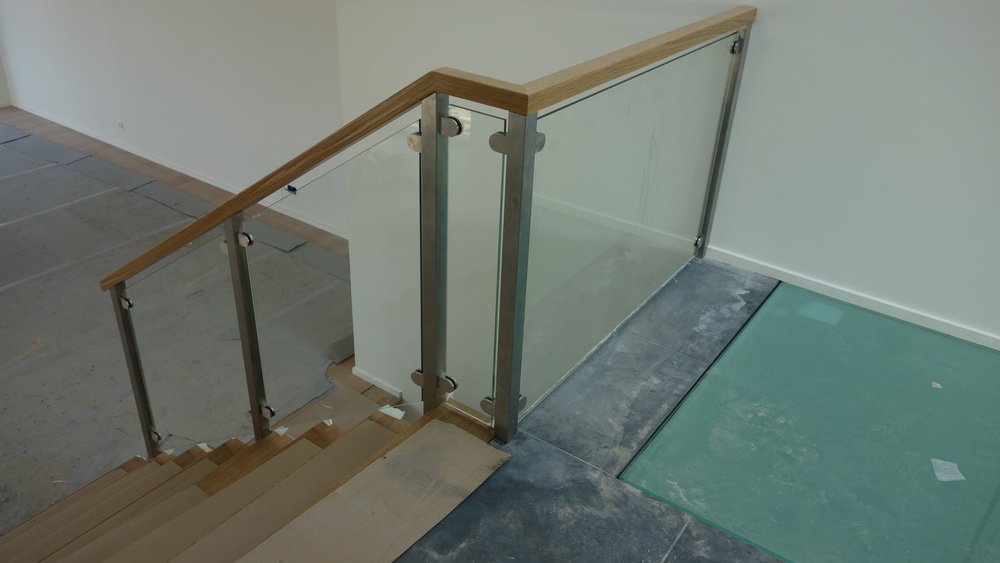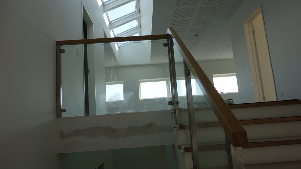 | Gelænder med mæglere (de lodrette stålbeklædte "pinde" og balustre (som [...]her er glaspladerne). Læs mere...↑ | Mere trappe. | |||