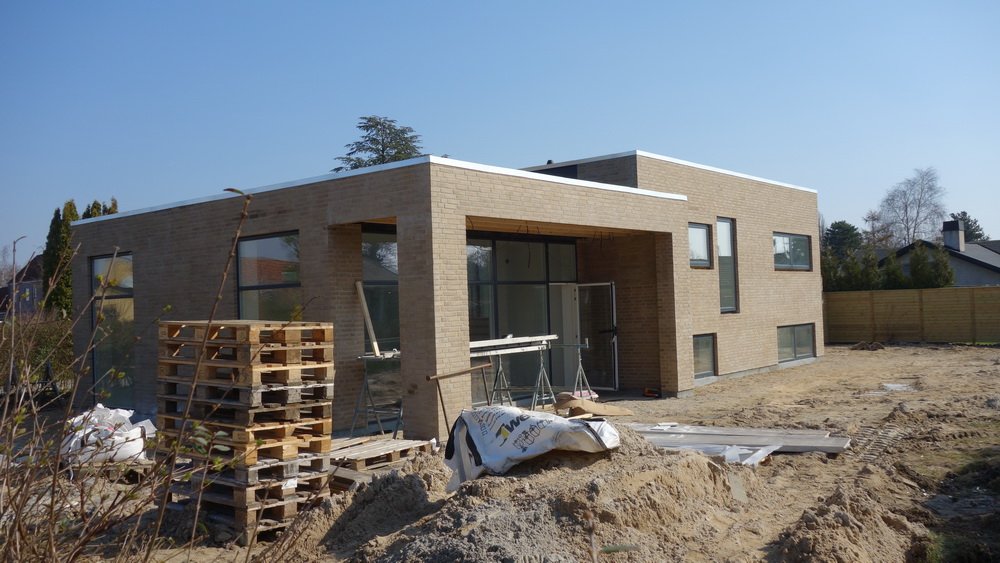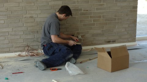 Elektrikeren er i færd med at forbinde og montere de sidste dåser. I murstensvæggen i stuen skal der lige mures lidt.