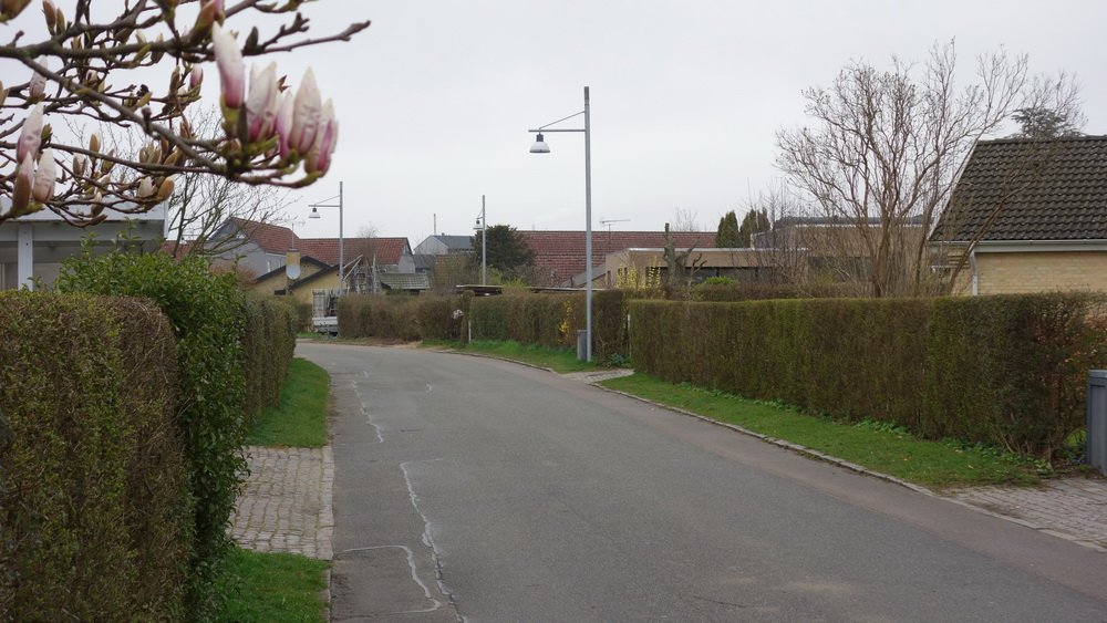 Magnolien er ved at springe ud i alle haverne. Vagtelvænget 9 er derude. | Bemærk | sålbænken |