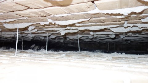 sådan skal den IKKE være! | Trappen op, endnu. | Stueoverdækningens beklædning er af: |