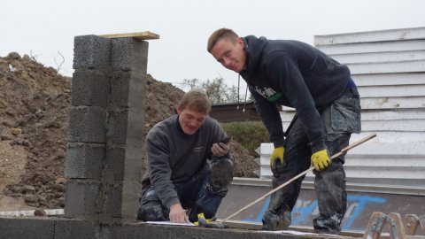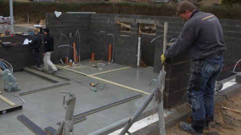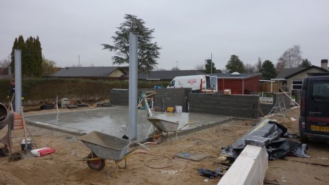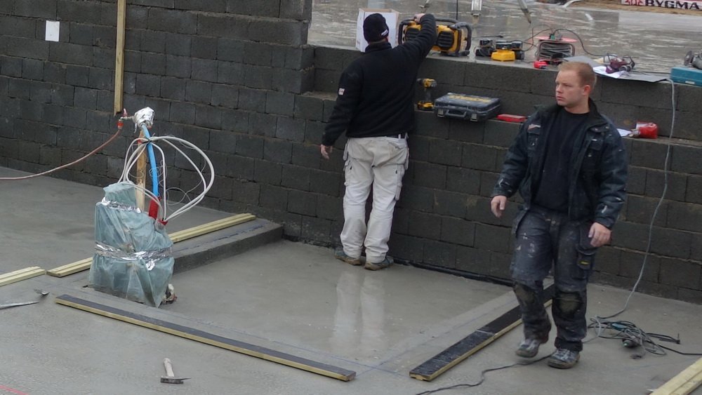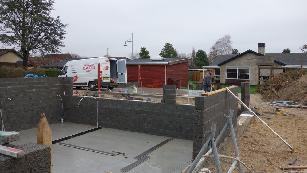 Der skal lige repareres nogle lecablokke, for de sidste der blev muret op nå [...]ede ikke tilstrækkelig styrke til "Bodil" kom. Læs mere...↑ | Så lægges der remme i kælderen. | ![]() To tømrere er i gang med at lave værelserne. |