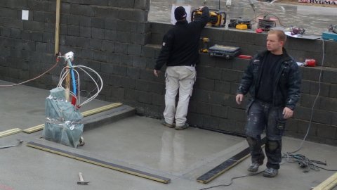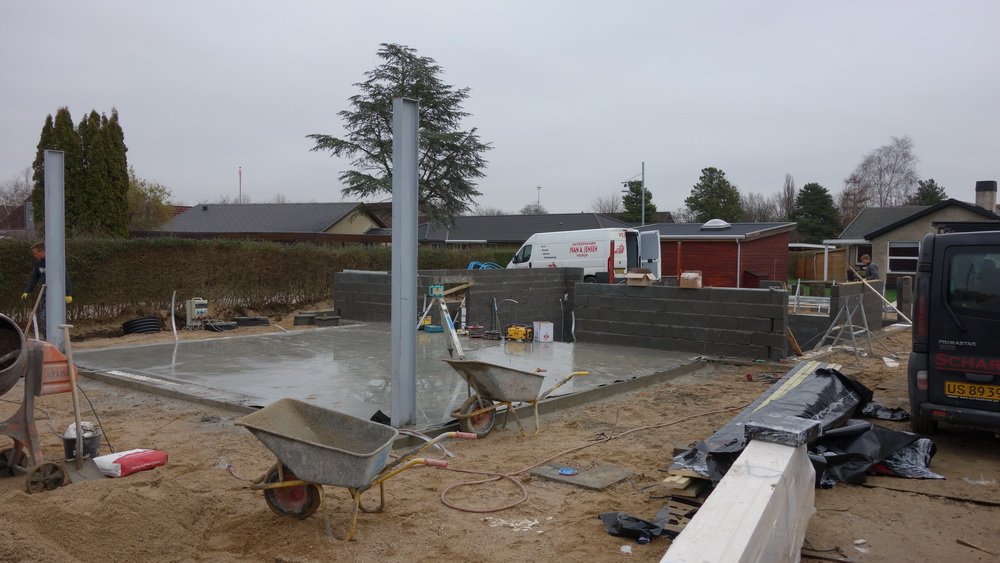 Fundament/beton/afløbs-folkene blev færdig torsdag, men ½ time for sent til at komme over Storebæltsbroen, som først åbnede kl. 4 - det blev til MANGE timer i en kedelig varebil, men hjem kom de og kunne holde en god weekend.
