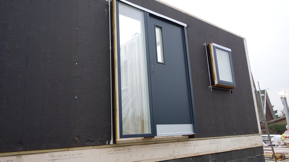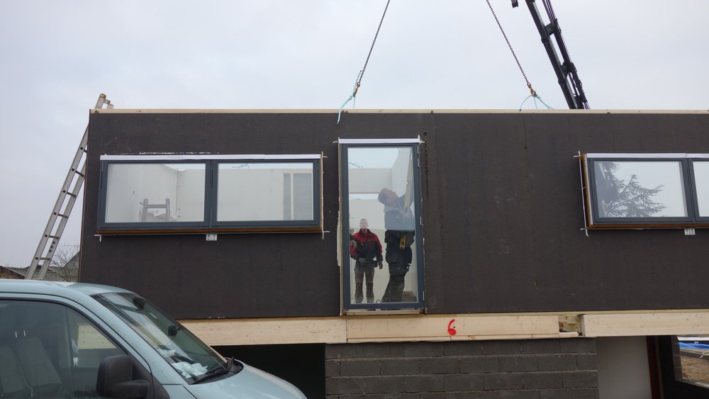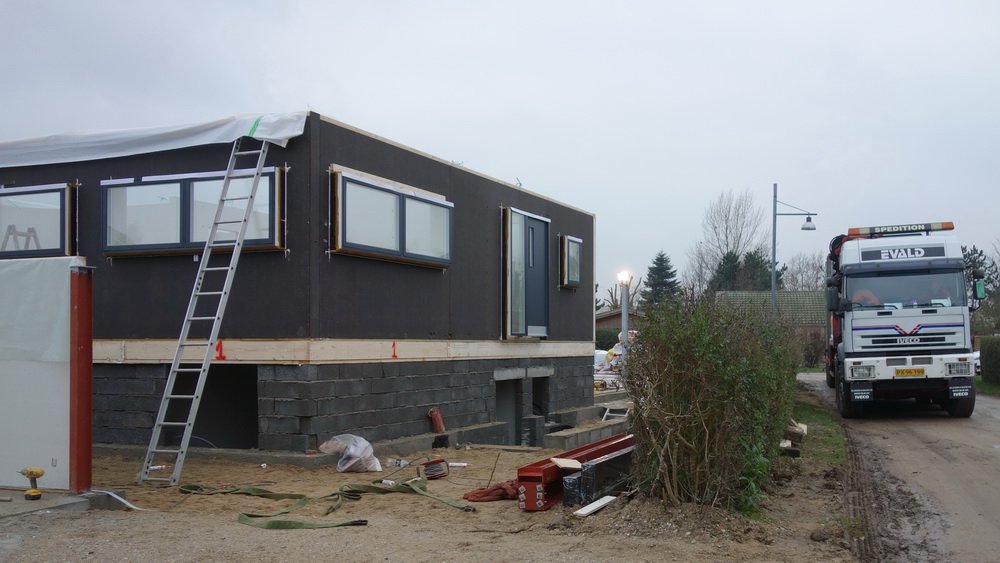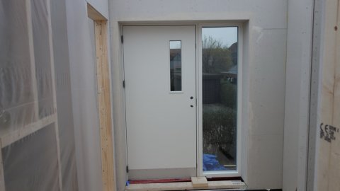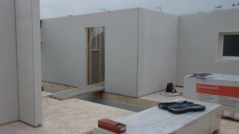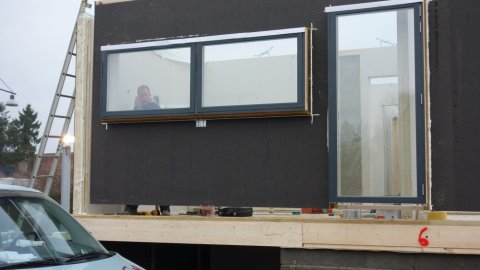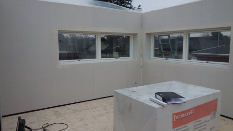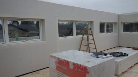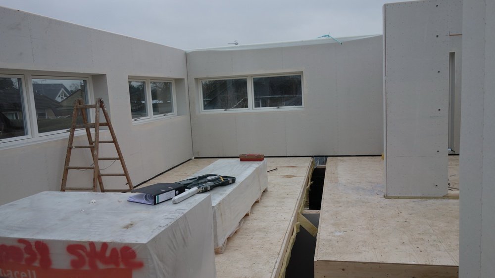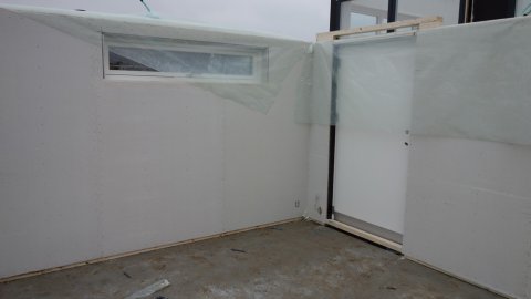 ![]() - | ![]() Klargøring til placering af sydfacaden. | Her er der en "terrassedør" - den er lidt højt oppe. |