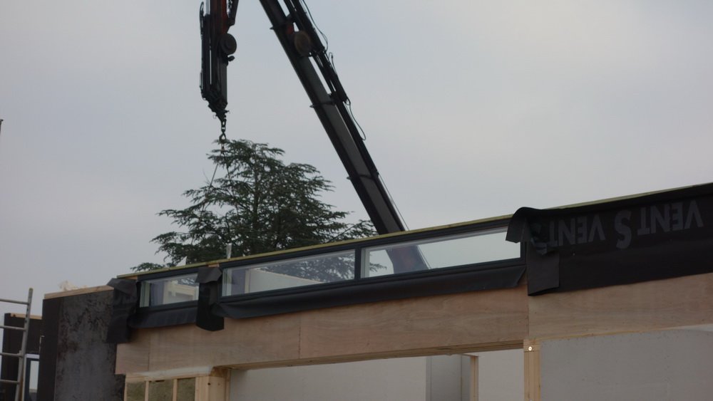 Vinduer fra køkken/alrum hen over taget på stuen - er meningen. | Her kommer væggen til sydfacaden. | Men den skal jo ikke være der. |