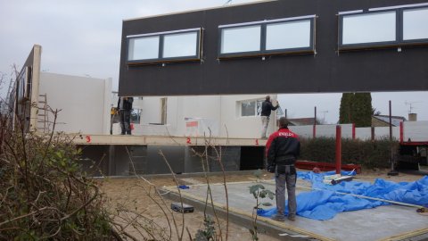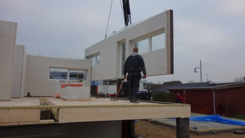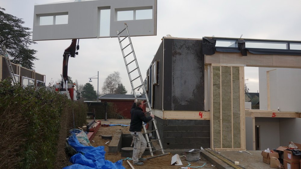 Man har været i gang længe - så der er sket en helt masse. Udvendige vægge med monterede døre og vinduer placeres på remmene. Nu kan man endelig se nogenlunde hvor stort det bliver. Det er faktisk ikke så dominerende og vil sikkert falde ind i miljøet. Kl. 11:30 er de sidste vægge monteret på øverste plan.
