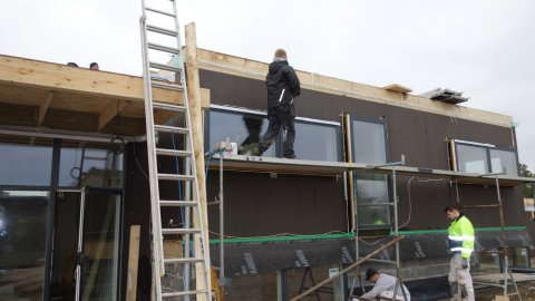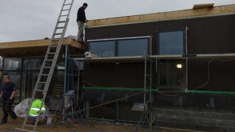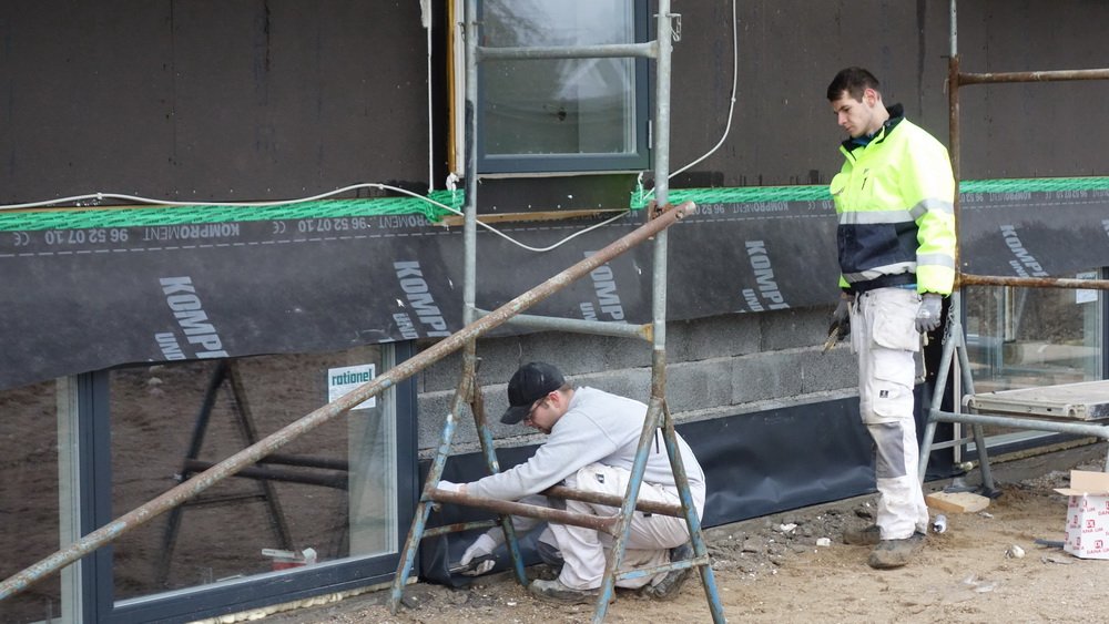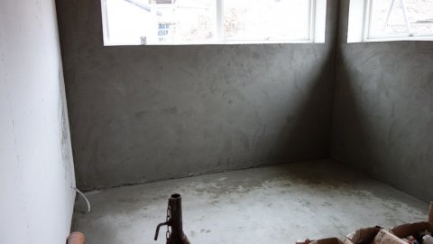 Murerne er færdige med pudsning i kælder. Sidste opgave idag er montage af mur"pap" på fundamentet så der er klart til at lægge sten. Dette hold skal IKKE lægge sten men kommer først igen når der skal lægges fliser.