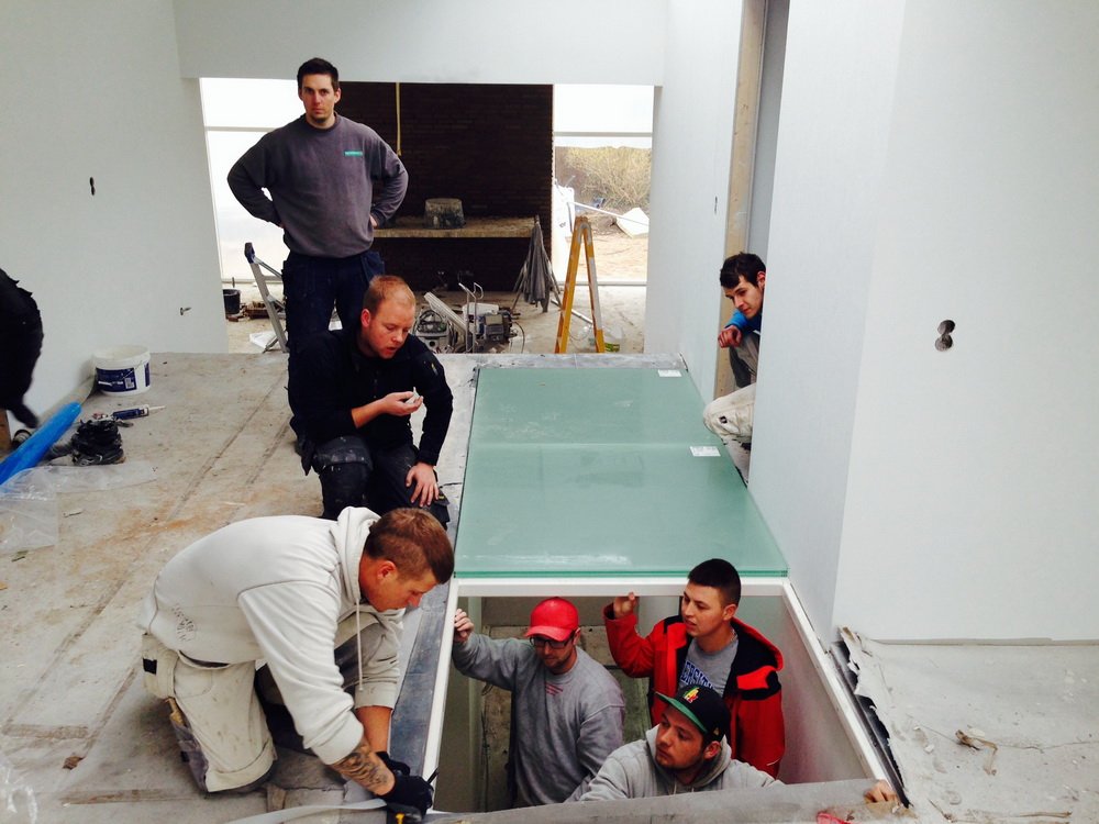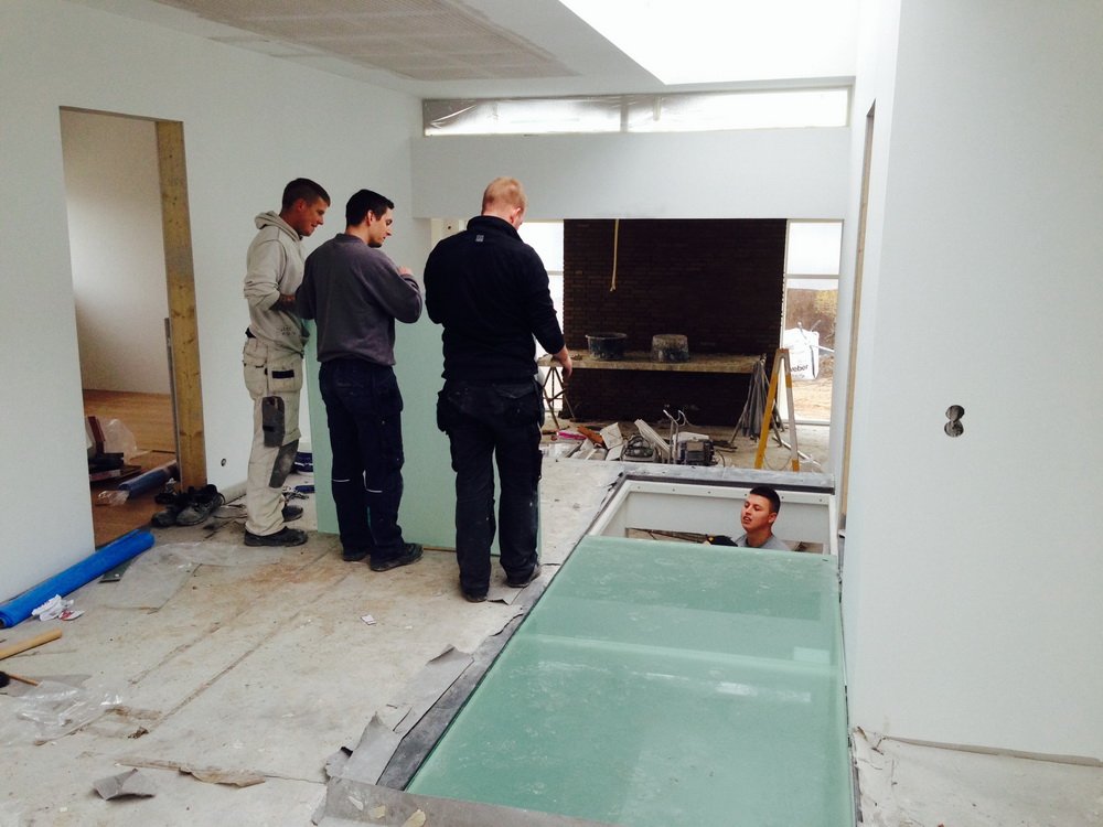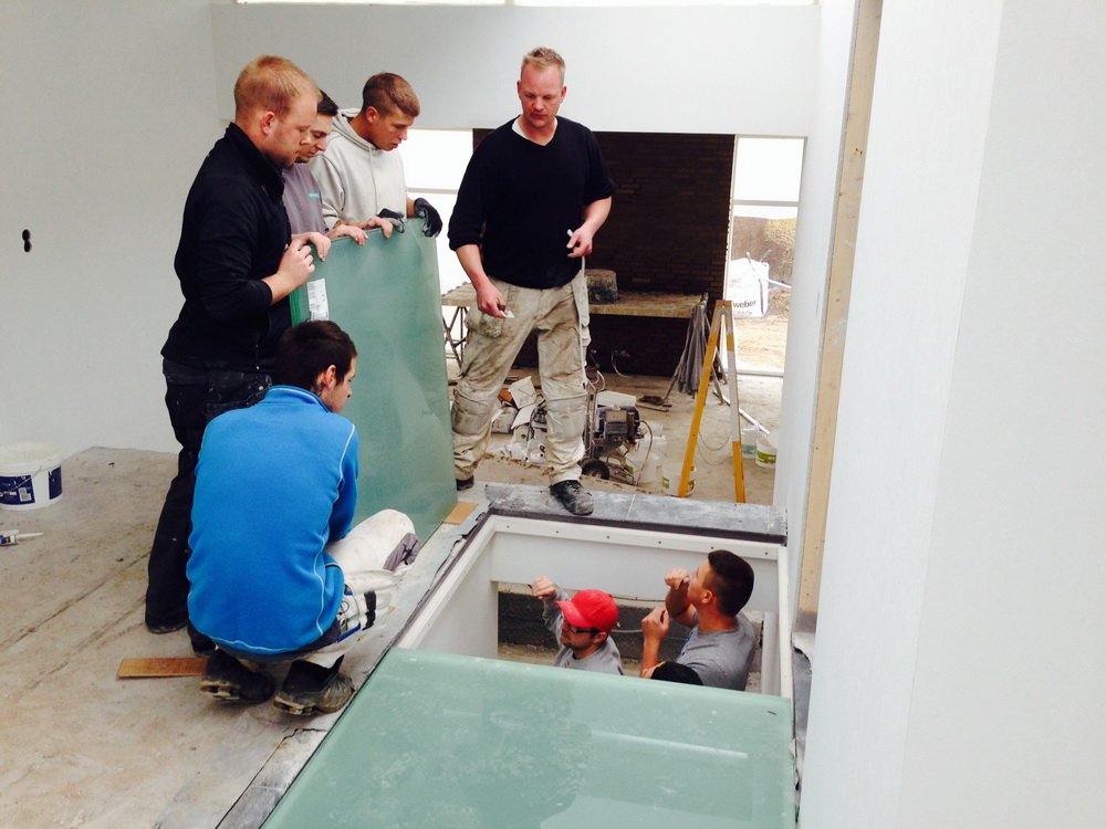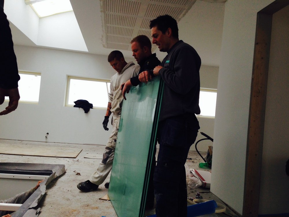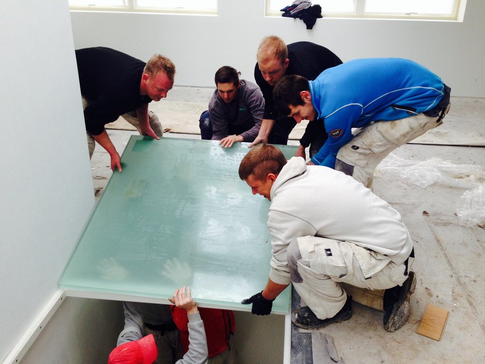 De 3 glasplader til gulvet, er noget TUNGT noget. Der skulle - som det fremgår - 4 stærke håndværkere til at bære dem, og endnu flere til at lægge dem på plads. Jeg kan tælle 7 til 8 mand der er i gang. Det er noget HEAVY STUFF, som man siger på dansk.