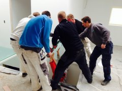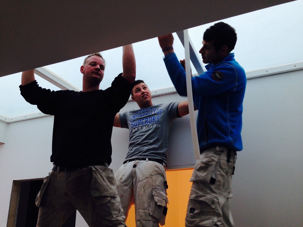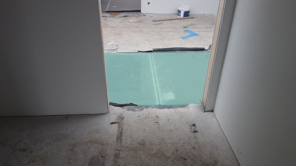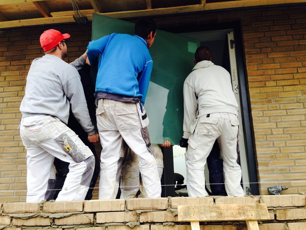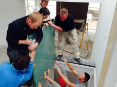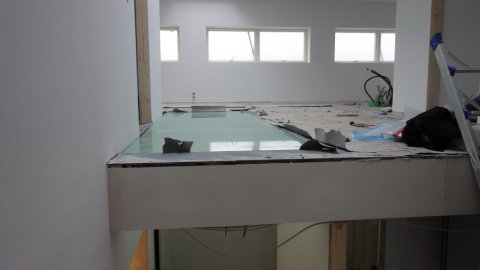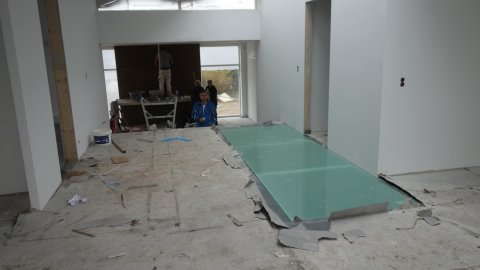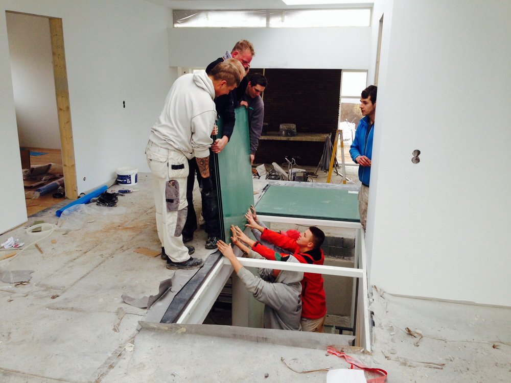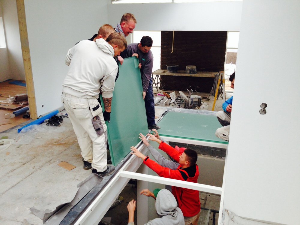De 3 glasplader til gulvet, er noget TUNGT noget. Der skulle - som det fremgår - 4 stærke håndværkere til at bære dem, og endnu flere til at lægge dem på plads. Jeg kan tælle 7 til 8 mand der er i gang. Det er noget HEAVY STUFF, som man siger på dansk.