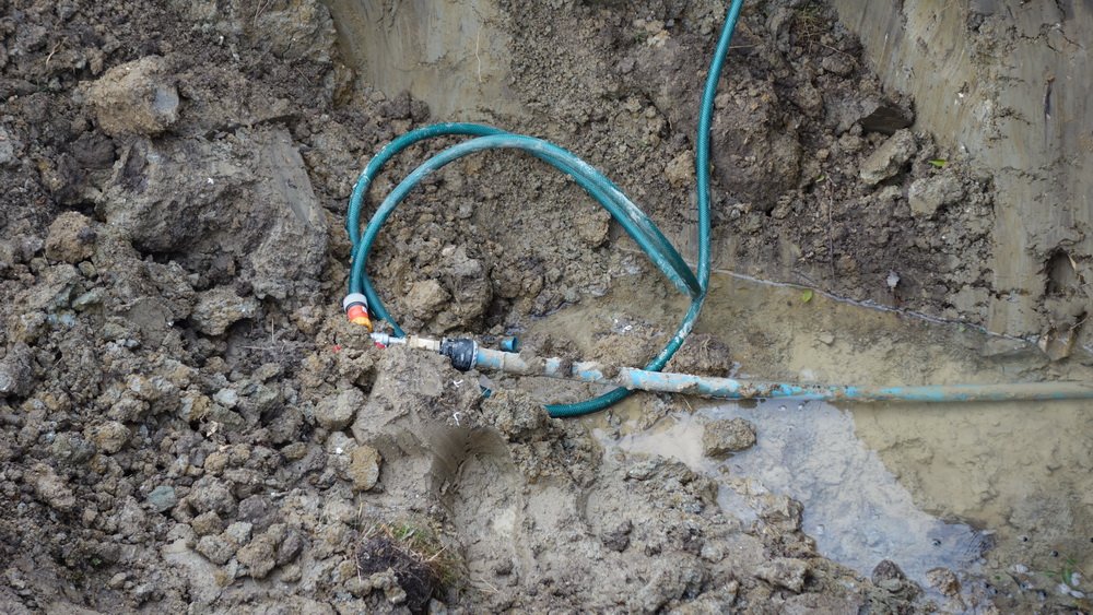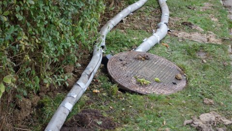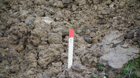 Det hele skal rykkes 29 cm, så kommer det til at stå 40 cm. fra skellet. Nu har landmåleren fået de rigtige tegninger og afsætter atter huset, denne gang efter de rigtige specifikationer.