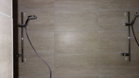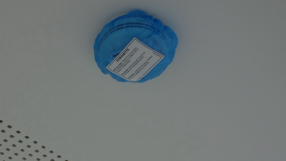 ![]() "svævende" toilet. | Mureren arbejder med hovedtrappen, skudt fra en åben hoveddør. | ![]() Teknik. |