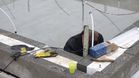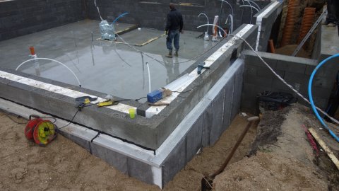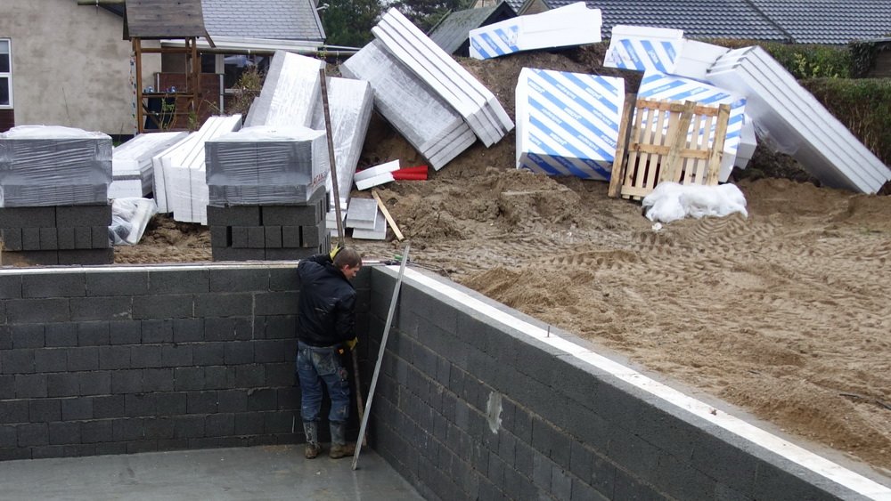 Udvendig isolering af kælderen er færdig. | ![]() Så bliver der lagt låg på. | ![]() Klargøring til de sidste blokke - i regnvejr. |