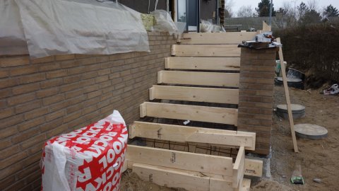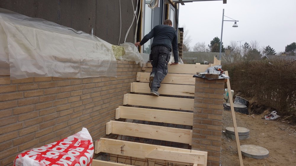 Bygherren sørgede lige for at trappen op blev rettet så den blev behagelig at gå på. Husker du formlen 2 X højde plus 1 X trinlængde skal være 62 cm. plus/minus 2 cm. og det skal helst være plus... det ser den ud til at blive.