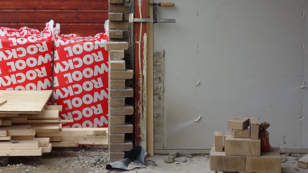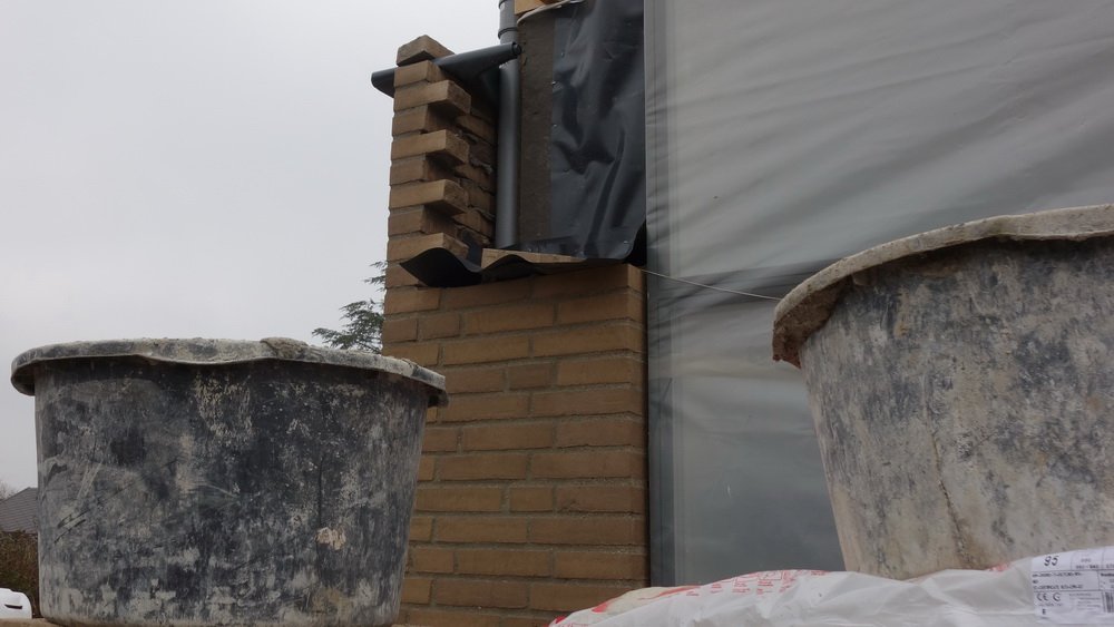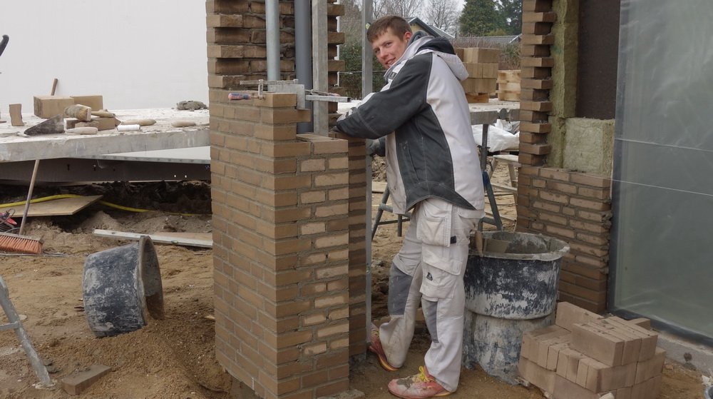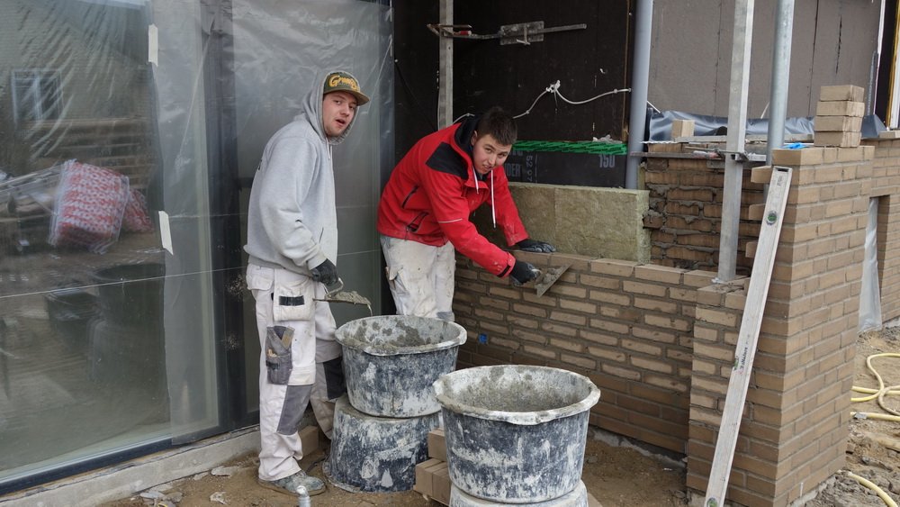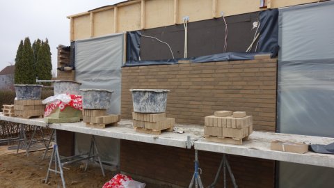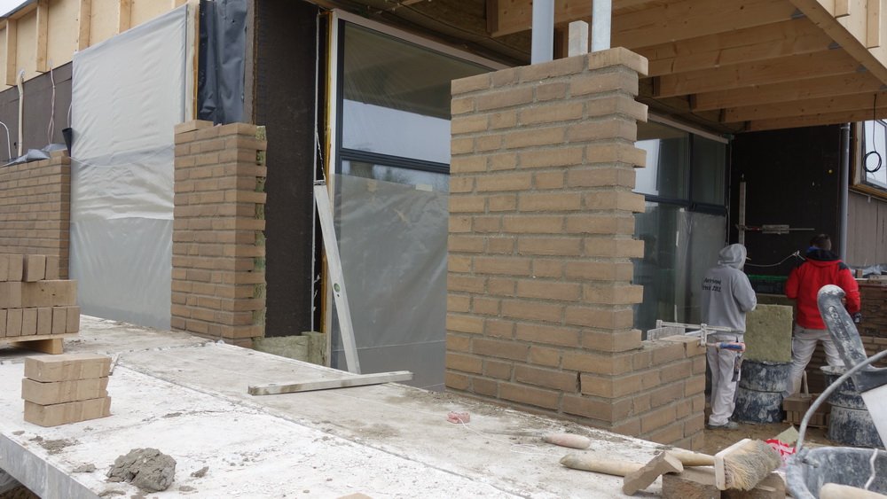 Murerne til skalmuren er også i fuld gang, og det ser faktisk interessant ud det de laver ved overdækningen ved stuen.