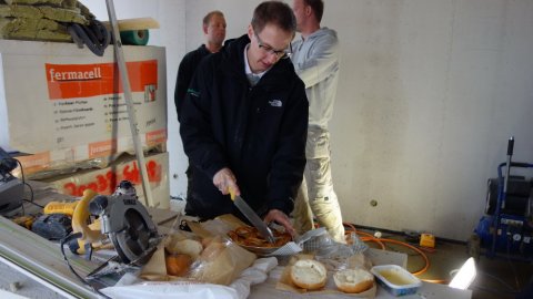 ![]() Der mangler et par VVS'ere til formiddagsbasser. | ![]() Læg mærke til byggelederens værktøj. | ![]() Danhaus bygger STORT. | |||