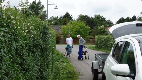 Så er den "nye" grundejer Johnny i gang med at klippe hæk. Det er det tredje sted han klipper; det "solgte" hus, hos mig, webmaster og her hvor det "nye" hus skal placeres. Her holder han endda pause og får en snak med en anden nabo fra [...]Svalevej nemlig Åge fra nummer 3.