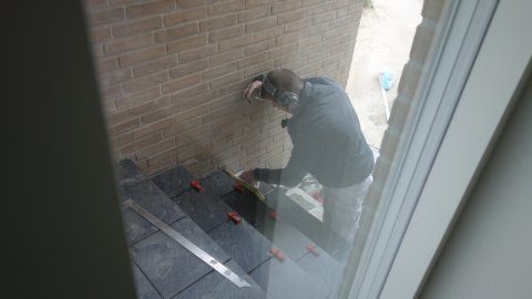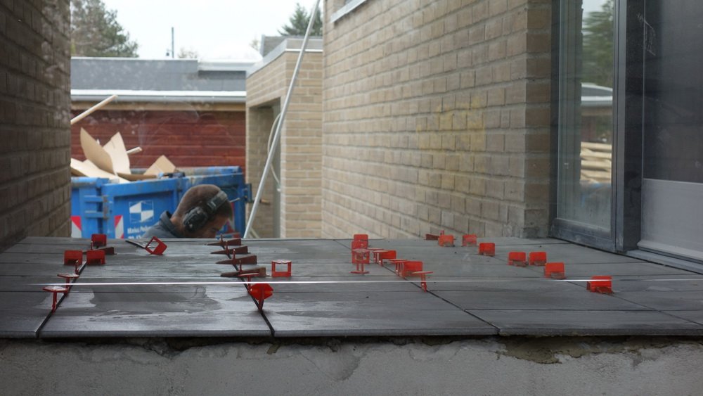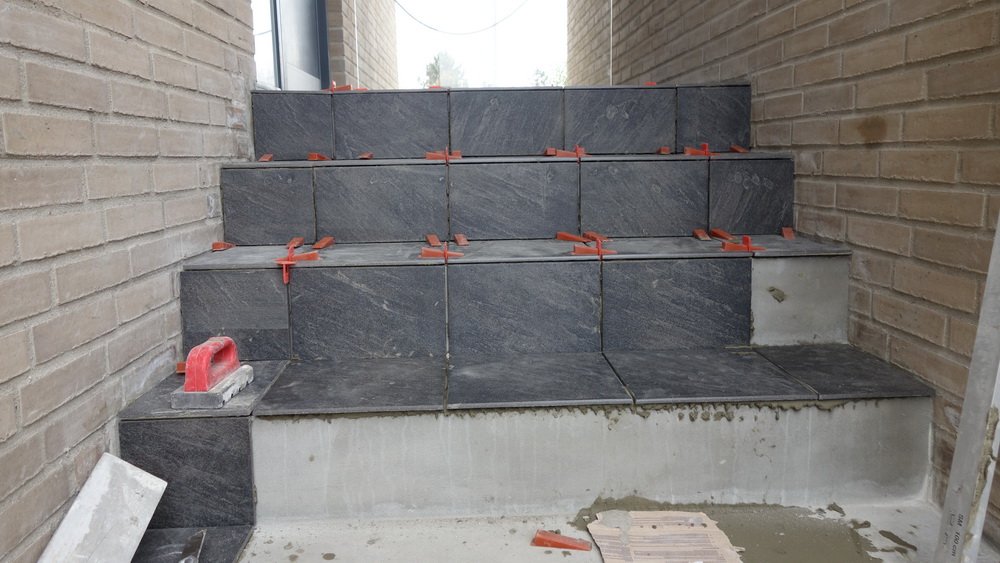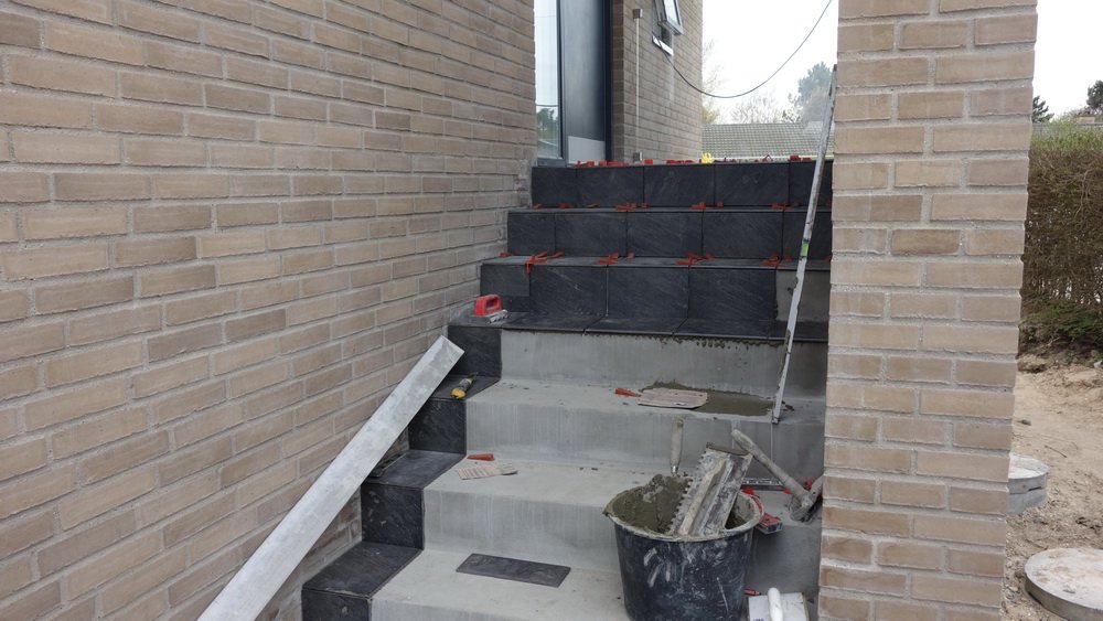 Murer Michael er i fuld gang på byggepladsen med at lægge fliser på de udvendige trapper. Det ser rigtigt ud.