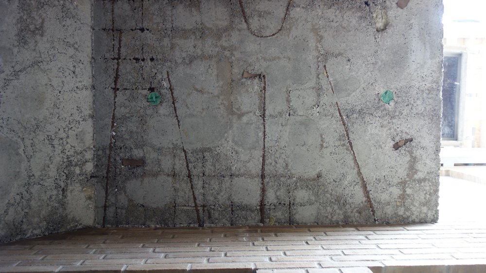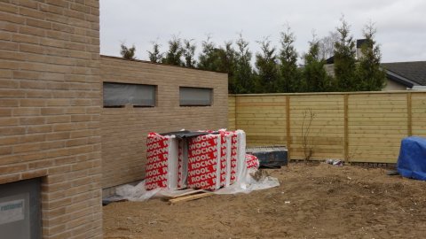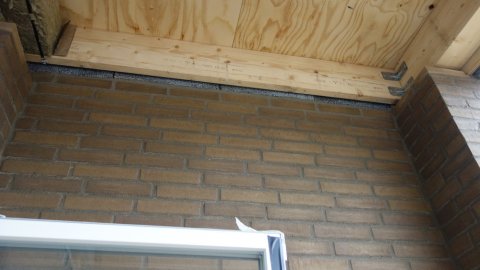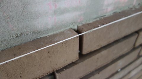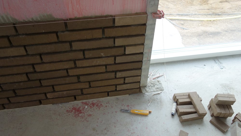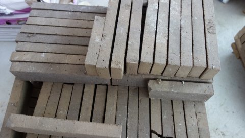 Den ene side i overdækningen er muret op. | ![]() Stuevæggen med mursten. | Så smalle er de. |