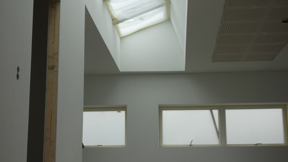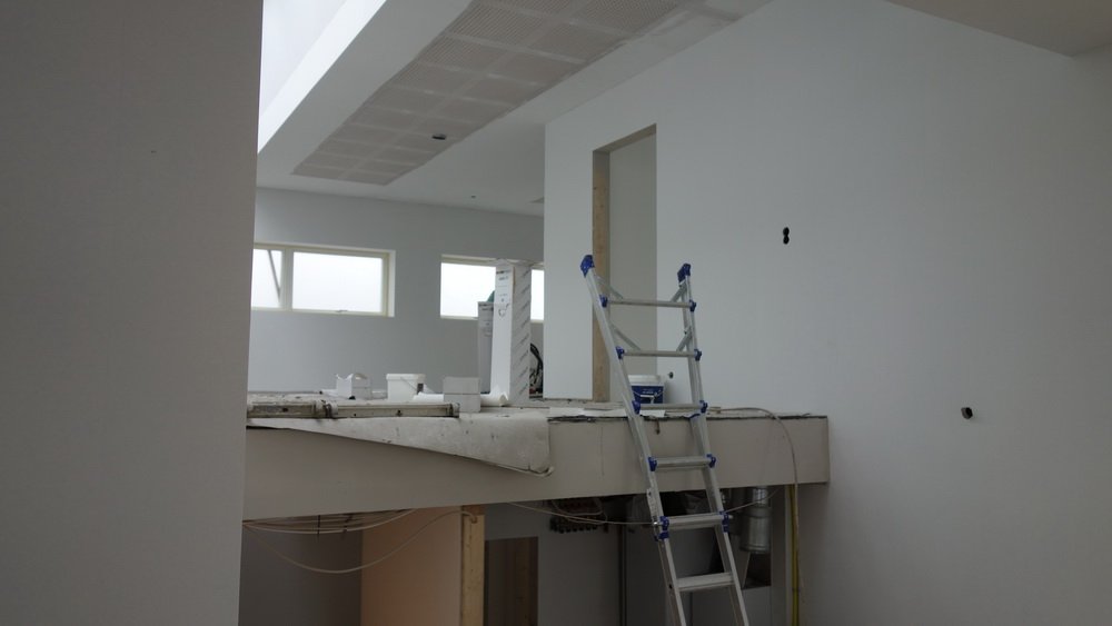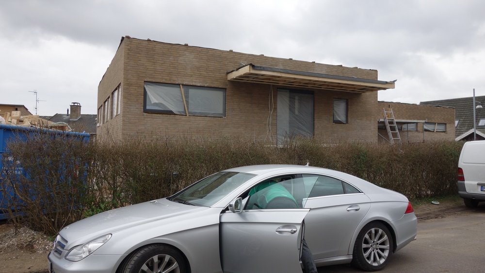 Derfor var der kun malere og murere i gang. Tømrerne havde lavet deres daglige arbejde og det kunne ses i form af halvtaget over hovedindgangen.