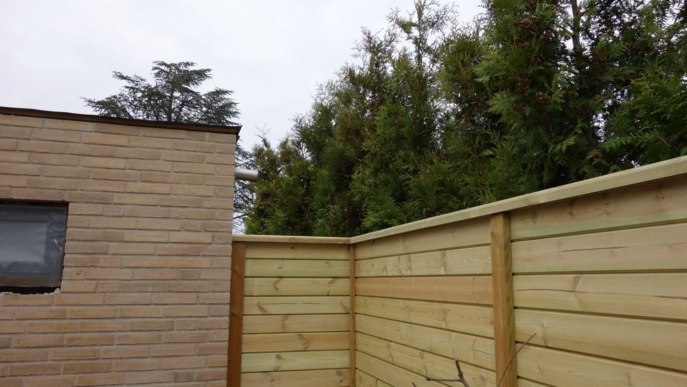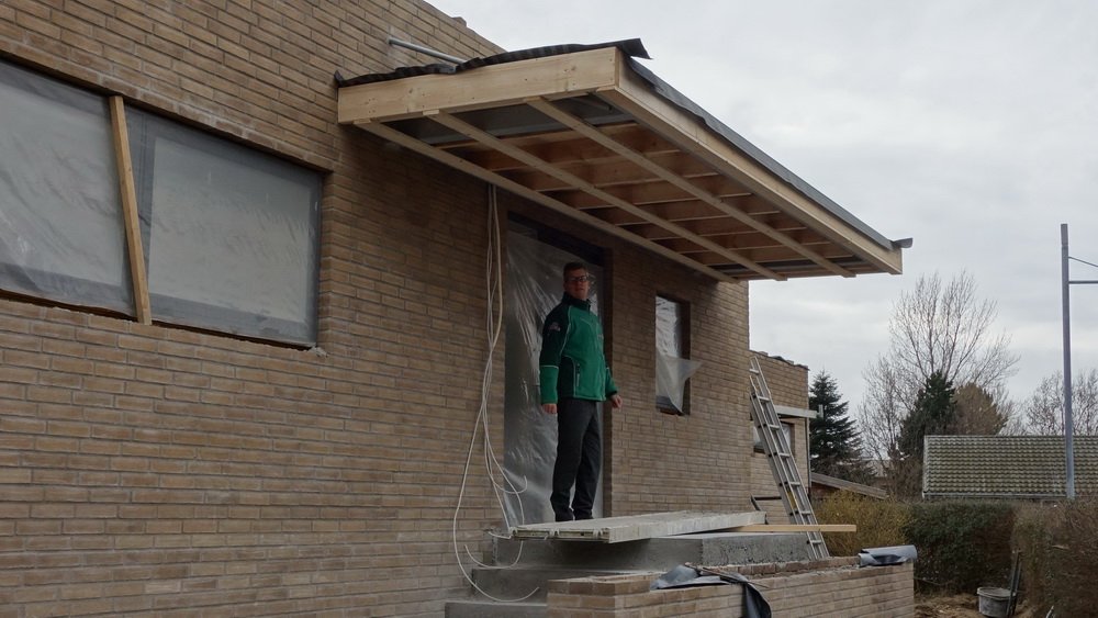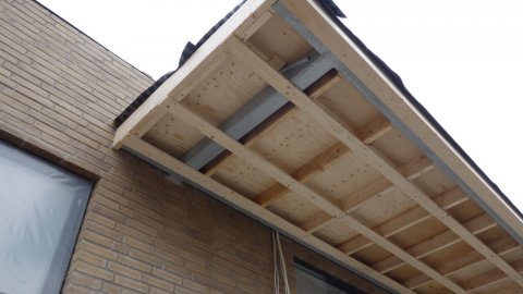 ![]() Det er godt nok nogle høje tujaer naboen har plantet her. | ![]() Halvtaget over indgangsdøren. | Tømrerarbejde, integreret i en stålkonstruktion. |