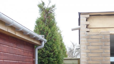 ![]() Sådan ser der nu ud. | Høje tujaer. | Der er noget armeringsjern synligt, det skal sikkert pudses op. |