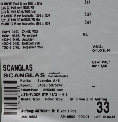 Bygherren er også på besøg denne eftermiddag. | ![]() Det er godt nok nogle kraftige glas i alt mere end 38 mm efter min hovedregning. | ![]() Limet sammen af 3 stykker med noget specialfilm imellem. |