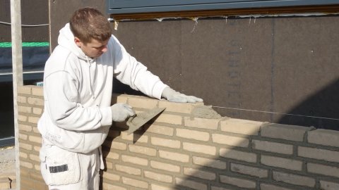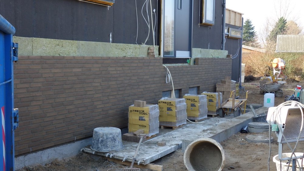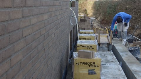 Der er gang i den denne tirsdag formiddag ved 11-tiden. 3 murere og 2 malere. Fik også hilst pænt på malerne der er i gang med at spartle stuen. De kommer fra Esbjerg (en dejlig by) og pendler syd fra grænsen, men vi kan godt kommunikere.