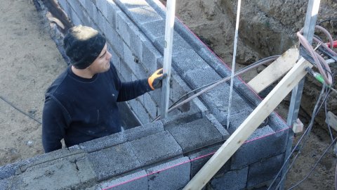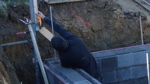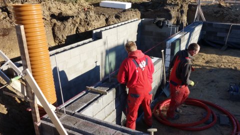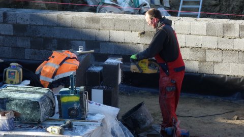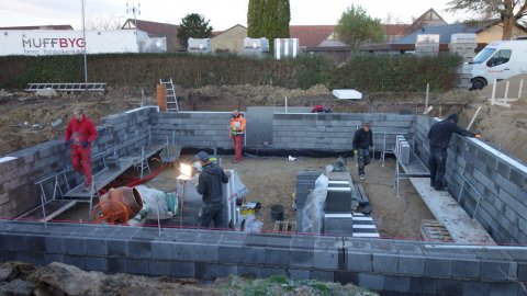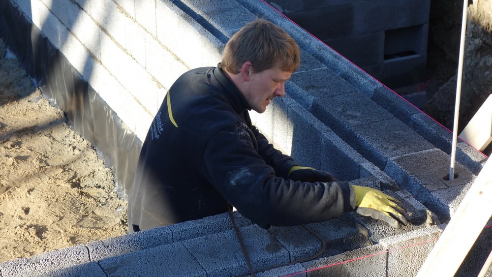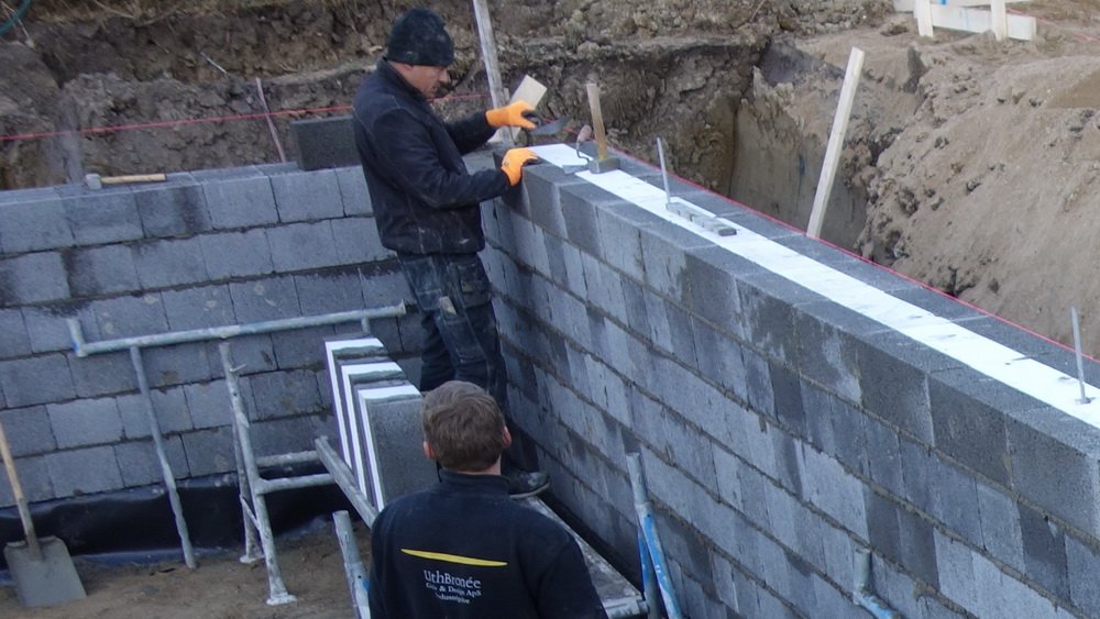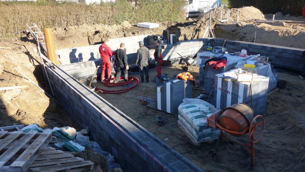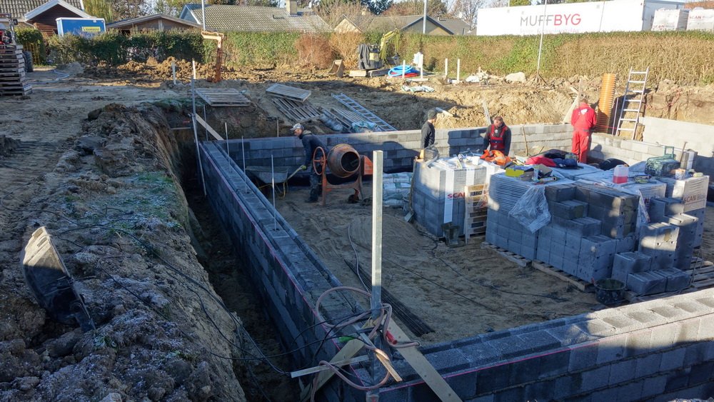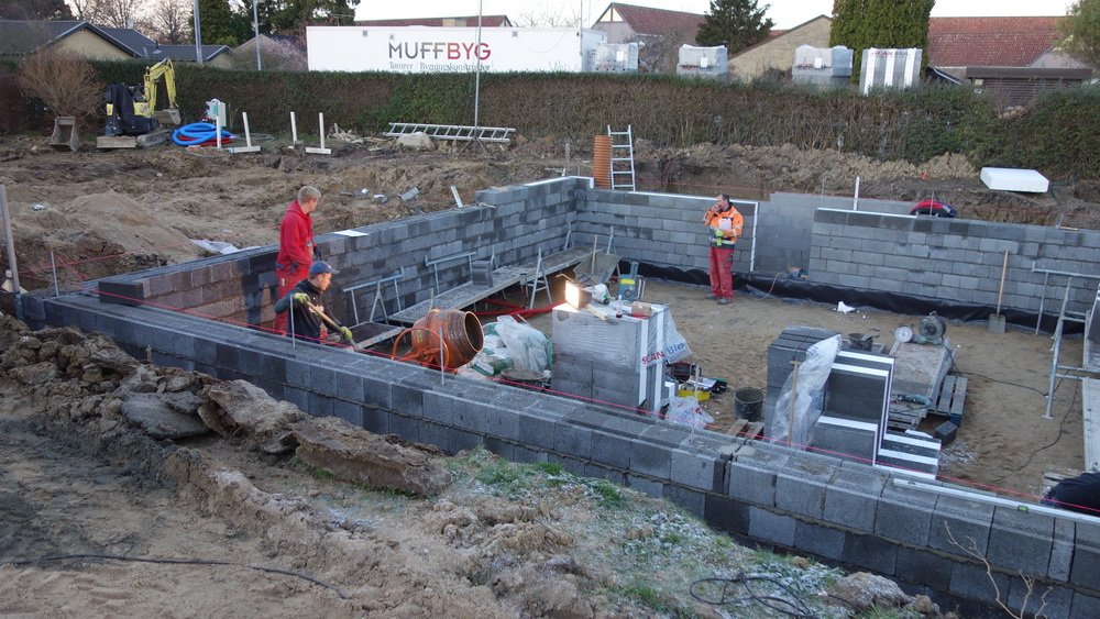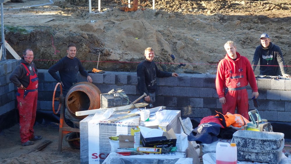 Der er 5 friske håndværkere i gang, og det ser ud til at de arbejder godt sammen. Ved mit andet besøg er man langt fremme, men se selv billederne, og læg mærke til at der kontrolleres hele tiden med waterpasset og snorene.