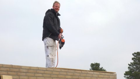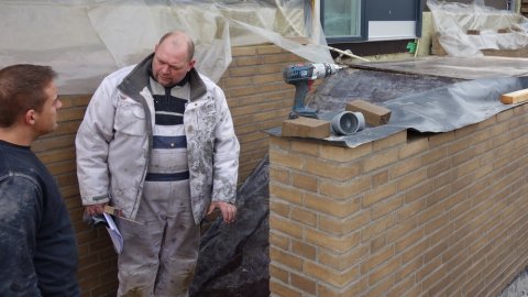 ![]() Tømreren Kristoffer skal i gang med topinddækning af muren i garagen. | ![]() "trappeeksperterne" i snak. |