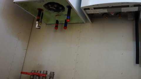VVS udstyret i teknikrummet under den kommende trappe op fra stuen til køkken/ [...]alrum. Fra venstre: varmtvandsbeholder, gasfyr og ventilationsbox med varmeveksler og indblæsning og udsugning. Læs mere...↑ | ![]() Der skal monteres en masse rør herunder. | - |