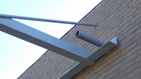 ![]() Oppe i rigtig højde også mod nord og hoveddøren. | ![]() Stillads skilles og stavles. | Det står bare |