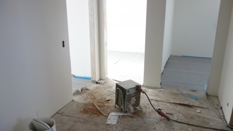 Gulvmanden (flottegulve.dk) er i gang med det sidste gulv i stuen. Det passer rigtigt godt til murstensvæggen og de hvide vægge.