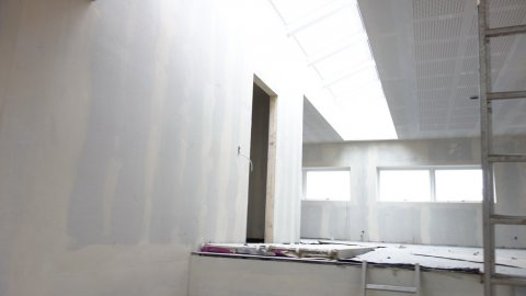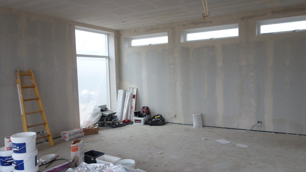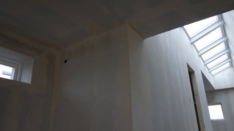 Ja, malerne er færdige med den første spartling. | Der er lys på. | - |