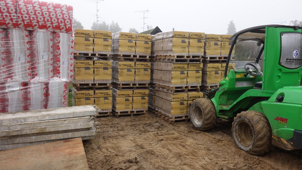 ![]() Men det bliver pænt. | ![]() Hovsa, der er en der er løbet med målet på fundablokkene, må [...]ske har de forskubbet sig da der blev fyldt beton i. Det giver bare lidt efterhjælp. Læs mere...↑ | Isolering og mursten sammen med arbejdstraktoren. |