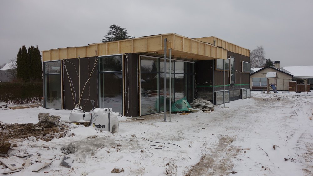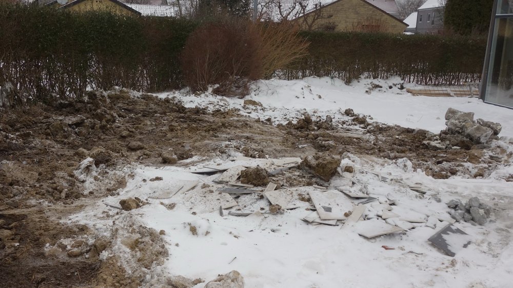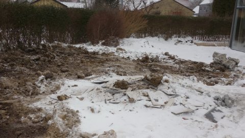 Vogmanden der skulle hente overskudsjorden kørte det sidste læs væk ved 13:30- tiden. Huset var ikke låst og der holder en tømrervarebil udenfor, men der er ingen fodspor i sneen udover mine.