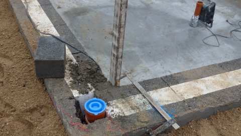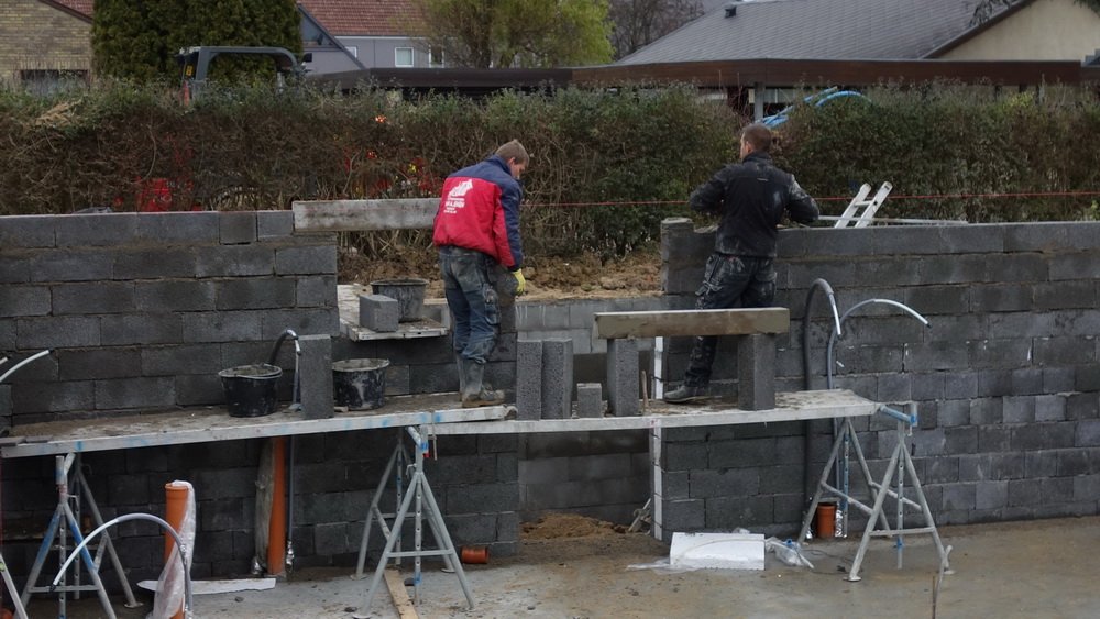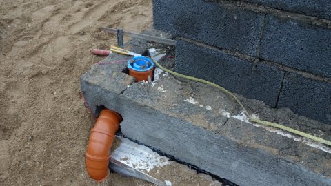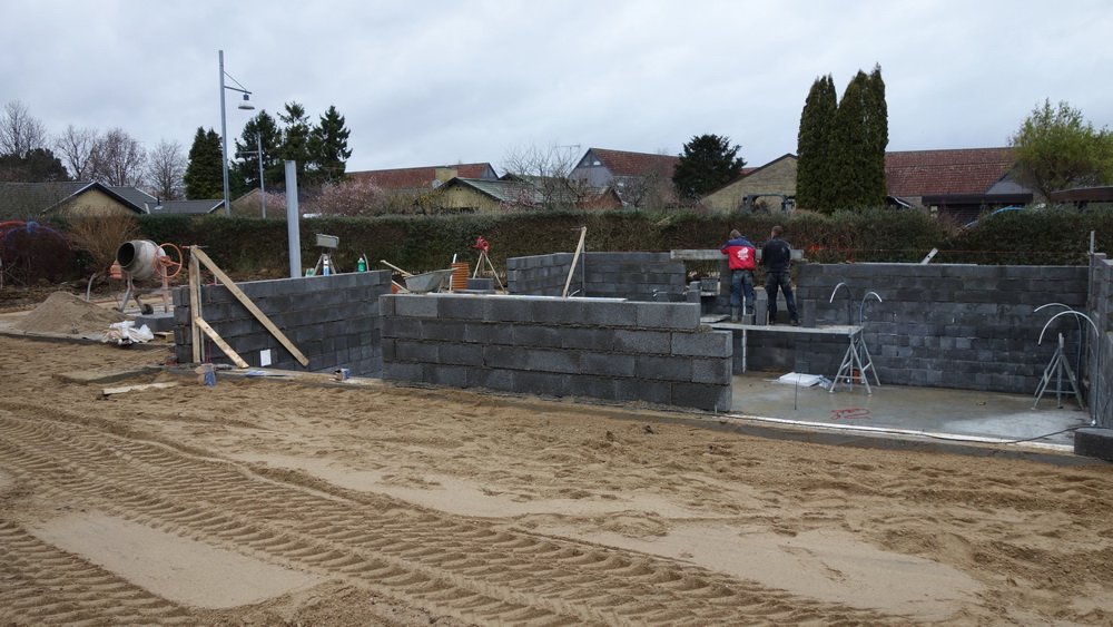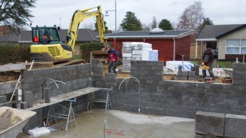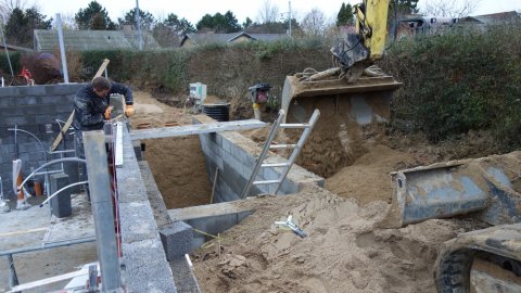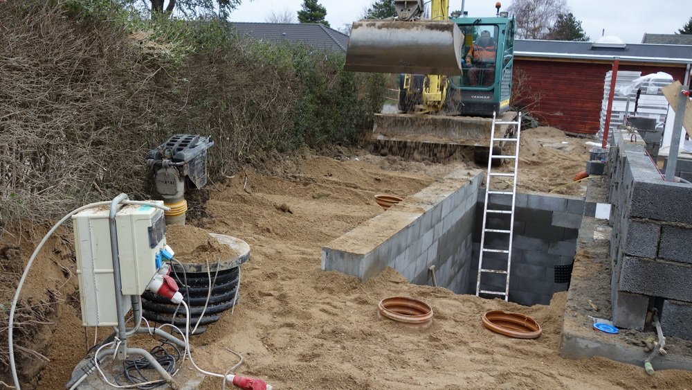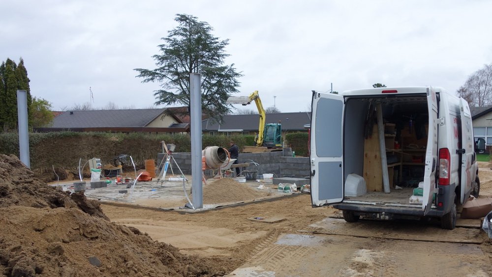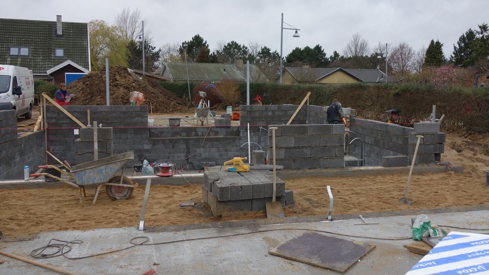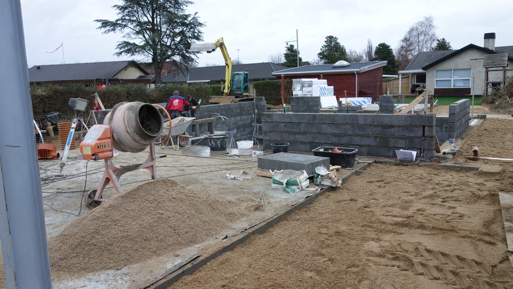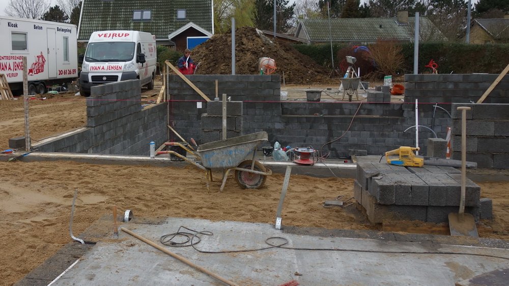 Afløb fra tag er lagt og kloaken er færdig. Der dækkes og fyldes grus i alle udgravninger. Nu kan man gå rundt om det kommende hus.